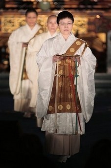 中新網(wǎng)12月16日電 綜合報(bào)道,日本東京的筑地本愿寺(Tsukiji-Honganji temple)迎來了一場特殊的時(shí)尚走秀。約40名日本僧侶在寺中搭起T形臺(tái),身著各色僧侶服裝進(jìn)行展示。舉辦此次活動(dòng)的僧侶們表示,他們這樣做是為了弘揚(yáng)佛教文化,吸引年輕人關(guān)注佛教。
