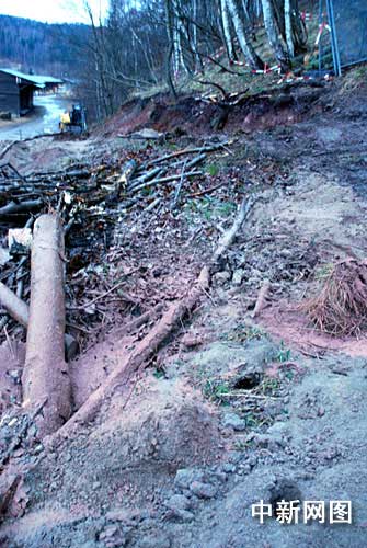 冷風吹動紅白相間的警戒帶,推土機挖掘出的一條大約3米寬的斜坡路旁邊橫七豎八地倒臥著被伐倒的樹木,路邊和路中間“探寶”留下的的鉆孔清晰可見。斜坡上一塊大約10多平方米的平地上連著至少鉆了4個洞孔,每個間隔只有60厘米,四周散落著淡紅色的巖石粉末。