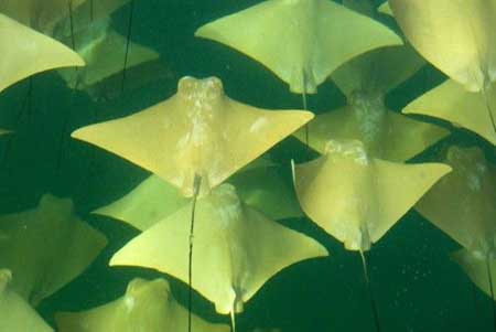 從鰭尖到鰭尖,牛鼻黃貂魚(yú)寬2.1米,以成群結(jié)隊(duì)進(jìn)行長(zhǎng)途遷徙而出名。在大西洋,它們春季末向北遷徙,秋季末則向南遷徙。據(jù)估計(jì),這次墨西哥海灣遷徙的牛鼻黃貂魚(yú)多達(dá)10萬(wàn)條,從美國(guó)佛羅里達(dá)順時(shí)針前往墨西哥的尤卡坦半島。