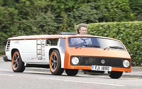 這輛露營車被命名為“敞篷蛋糕(Van-Cake)”,時速最高可達128公里/小時。桑德斯的團隊將原有大眾車1.38米高的頂棚切割掉,改裝成了一個35厘米高的頂棚。他們在車內(nèi)放入新的操縱系統(tǒng)和低矮的座位。受制于空間,這輛車不是使用腳剎,取而代之的是手動剎車和變速桿;燃料槽也是經(jīng)過特別制作的。目前已經(jīng)取得合法上路的資格。由于這輛車非常矮,它可以輕松地從停車場柵欄下通過。