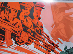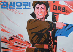 二00七年夏天,朝鮮當(dāng)代畫家作品和國家畫室制作的宣傳海報(bào)在倫敦La Galleria首展時(shí),現(xiàn)場(chǎng)掛滿了朝鮮紅色的旗幟,英倫天空從來沒有那么朝鮮。