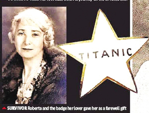 據(jù)悉,當(dāng)“泰坦尼克號”在1912年4月14日深夜撞上冰山沉沒時,羅伯塔和她的船員戀人遭遇了痛苦的生離死別。那名船員在郵輪即將沉沒時做出了一個無私的舉動:他將自己身上唯一一件救生衣脫了下來,穿到了羅伯塔身上,并將羅伯塔護(hù)送上了一艘救生艇。當(dāng)羅伯塔乘坐救生艇從“泰坦尼克號”船舷邊被放下大海時,那名船員將自己身上一枚白星公司的徽章摘了下來,塞進(jìn)羅伯塔的手中作為紀(jì)念物。