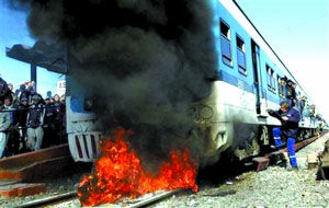 阿根廷電視臺(tái)畫面上,布宜諾斯艾利斯西郊梅洛站?康囊涣谢疖嚸爸跓,火焰吞沒整列火車。在鄰近梅洛的卡斯特拉爾站,乘客向售票處投擲石塊,站在鐵軌上阻止列車進(jìn)站。
