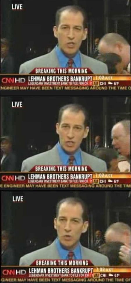 據韓國《朝鮮日報》報道,14日凌晨(當?shù)?美國有線電視頻道CNN以緊急新聞的形式報道了雷曼兄弟公司向法院申請破產保護的消息。該新聞是以在直播間與趕赴紐約時代廣場雷曼公司總部的CNN現(xiàn)場記者直播連線的方式播出的。