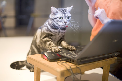 一只美國短毛貓在秀計算機技能。