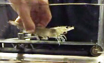 科學(xué)家為試驗(yàn)蝦在尋找食物時最遠(yuǎn)可以“旅行”的距離,日前將一只用作試驗(yàn)的蝦放在一個水中小型跑步機(jī)上。這只蝦隨后在跑步機(jī)上“奔跑”起來,速度竟然高達(dá)每分鐘20多米。而為了尋找到食物,它可以在跑步機(jī)上“奔跑”長達(dá)3個多小時。