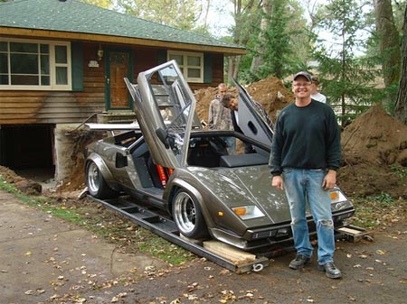 據(jù)俄羅斯新聞網(wǎng)報(bào)道,這名美國人在自家地下室,用時(shí)17年手工打造出自己的超級蘭博基尼跑車。但如何從地下室脫出跑車又成一問題,為此Imhoff不惜墻倒屋塌,專門找來掘土機(jī)在自己房屋下開出一個(gè)大洞,成功將跑車?yán)鰜怼T谶@個(gè)過程中,他唯一擔(dān)心的是砸下了的石頭會(huì)否砸壞他的愛車。