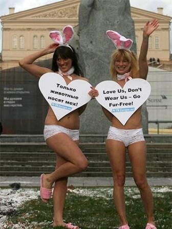 “兔女郎”站在寒冷的莫斯科市區(qū),高舉“愛(ài)我們,不要穿皮草”的標(biāo)語(yǔ)。