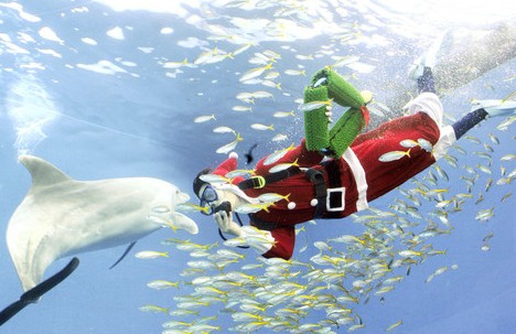 中新網(wǎng)12月1日電 綜合報道,一名扮成圣誕老人的潛水員30日在日本橫濱八景島海洋樂園的水族箱內(nèi)喂一頭白鯨。這是圣誕節(jié)前的應景表演。