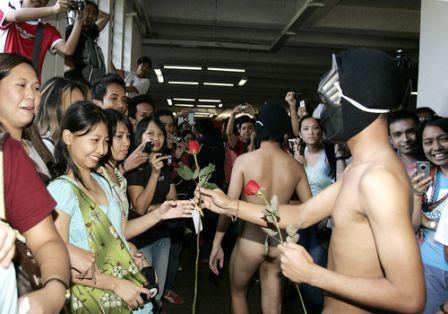 當(dāng)天,菲律賓大學(xué)校園內(nèi),由該校兄弟會(huì)組織的39名男學(xué)生頭戴面具集體裸奔,并向一路驚叫的女生送玫瑰。
