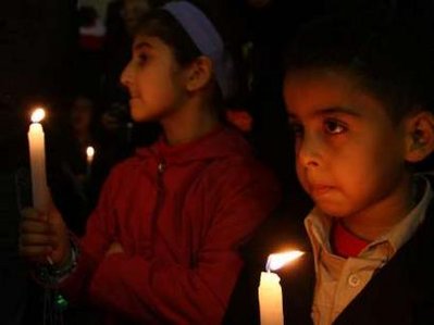 敘利亞兒童點燃蠟燭,參加抗議以色列空襲加沙的示威活動。