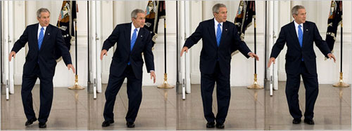 中新網(wǎng)3月7日電 美國共和黨總統(tǒng)參選人麥凱恩5日鐵定取得黨內(nèi)提名,氣勢逼人,約了總統(tǒng)布什吃午餐,作為布什正式宣布支持他的前奏,但竟然大牌到要布什在白宮門前久等。布什為打發(fā)時間,竟在一眾記者面前跳起踢跶舞(見圖),滿堂發(fā)笑。