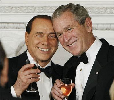 意大利總理貝盧斯科尼14日參加完在巴黎舉行的歐盟國家領(lǐng)導(dǎo)人會議之后,前往華盛頓會見布什。兩人舉止親密,臂挽著臂在白宮草坪散步,仿佛多年老友。當(dāng)晚,為了紀(jì)念“哥侖布發(fā)現(xiàn)美洲”和歡迎貝盧斯科尼,布什在白宮設(shè)宴招待一些美國和意大利政要。