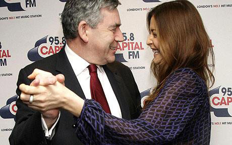 英國(guó)首相戈登·布朗11日出席倫敦一家廣播電臺(tái)的開(kāi)業(yè)大典,與被稱(chēng)為“英國(guó)保養(yǎng)最好的模特”的麗莎·史諾頓共舞。風(fēng)度翩翩的首相立刻迷倒一大片女性觀眾。