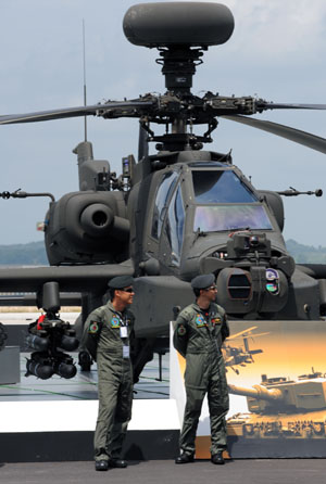 在新加坡航展上,俄羅斯沒有帶來什么吸引眼球的新產(chǎn)品。而美國則同印度防務(wù)展一樣,多家企業(yè)拿出拳頭產(chǎn)品。除已經(jīng)被世人所熟知的F-15、F-16戰(zhàn)斗機(jī)、AH-64“長弓阿帕奇”武裝直升機(jī)和V-22偏轉(zhuǎn)翼飛機(jī)等航展?屯,美國還推出了最新的第四代戰(zhàn)機(jī)F-35“閃電Ⅱ”。洛克希德-馬丁公司希望借此向亞太國家推銷500架左右的F-35,初步意向?yàn)槿毡尽㈨n國、澳大利亞和新加坡四個買家。