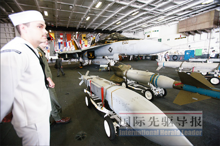 在飛行甲板上,一位名叫馬圭爾的海軍軍官向《國(guó)際先驅(qū)導(dǎo)報(bào)》記者介紹了艦上的艦載機(jī)。從EA-6B“徘徊者”電子戰(zhàn)飛機(jī)到E-2C“鷹眼”空中預(yù)警機(jī),從SH-60“海鷹”直升機(jī)到F/A-18“大黃蜂”的各種改進(jìn)型,他如數(shù)家珍。