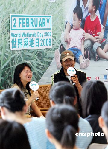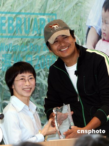 十月二十日,國際影視巨星周潤發(fā)在香港濕地公園舉行的世界濕地日2008香港區(qū)慶;顒(dòng)啟動(dòng)儀式上,獲頒濕地保育大使委任狀。中新社發(fā) 武仲林 攝