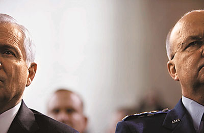 美國(guó)國(guó)防部長(zhǎng)蓋茨(左)與國(guó)家情報(bào)局長(zhǎng)海登的宣誓儀式。