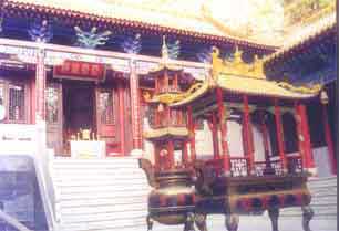 靈霄殿:殿內(nèi)中央供奉的是“玉皇大帝”,左為“天皇大帝”和“南極長生大帝”,右為“紫微大帝”及“后土皇地祗”.兩側(cè)為年、月、日、時四值功曹.道經(jīng)上說:天有三十六層,三清居最上三層.玉帝居三十三天為萬夫之主,主宰人間天上的禍福吉兇,及世界兵革、劫運,是民間信仰的最高神靈.左、右四位大帝,分別統(tǒng)帥萬星、萬雷、萬靈、萬地,以輔佐玉皇.傳說四值功曹體察人間善惡功過,時記月累,年滿上奏玉帝.臘月廿五玉帝下界巡世, 以人們所做的善惡或賜福或降惡。這天古代皇帝都要舉行盛大的祭天活動,以求國泰民安,天下太平.靈霄殿的兩壁畫的是“太乙救苦天尊”和“玄天上帝”帶領(lǐng)各自部下神將朝拜玉帝,奏事請旨的場面.畫中人物栩栩如生,神態(tài)端莊各異,體現(xiàn)了天界的莊嚴(yán)和諸神的無邊法力.當(dāng)年唐玄宗為感謝玉皇大帝的點化、護佑之恩,命人在這里修建了靈霄殿以及九曜星君殿和六丁六甲殿。