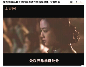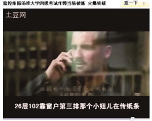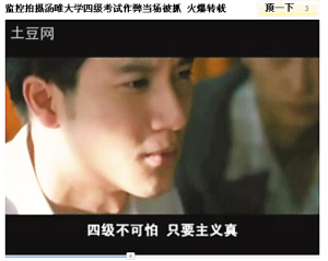 視頻的高潮出現(xiàn)在校方采取的反作弊行動(dòng),畫面切換成《無間道1》中黃秋生部署抓琛哥,臺(tái)詞卻換成:“這次四級(jí)考試,梁校長下令狠抓作弊,所以我們采用高科技無線遠(yuǎn)程監(jiān)考,考試的時(shí)候,大家用望遠(yuǎn)鏡遠(yuǎn)距離瞅著考場,一旦發(fā)現(xiàn)作弊的,立馬用手機(jī)報(bào)告抓捕大隊(duì),一個(gè)活口不留。”并加入聯(lián)通廣告元素。接下來,《越獄》里的林肯“奉命”拿著望遠(yuǎn)鏡報(bào)告:“26層102窗戶第三排那個(gè)小妞在傳紙條!薄缎略鷰熋谩防锏姆街蠸ir接獲報(bào)告后立馬拿著呼叫器大叫:“好,我們立馬去逮!弊詈,王佳芝和鄺裕民雙手被縛,跪在石礦場上,這時(shí)配上校方用無比嚴(yán)肅口吻說出的“宣判詞”:“王佳芝等同學(xué)作弊,違背了天天學(xué)習(xí),好好向上的校訓(xùn),現(xiàn)處以開除學(xué)籍處分。”