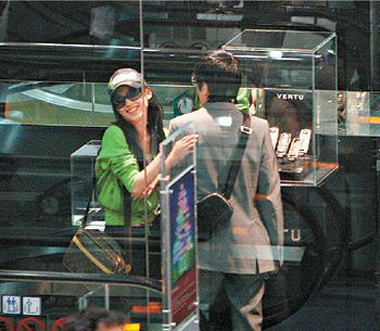 港媒稱,較早前,赴港出席完活動的黃圣依未有即時回內(nèi)地,選擇與經(jīng)理人男友留港購物。當日下午5時,架著墨鏡,戴上過時的Von Dutch貨車帽,穿上草綠色長袖衫背著6600元LV Reporter袋的黃圣依,與穿上灰色西裝的楊子在專賣極貴價手機的Vertu專門店中挑選電話,只見Eva對店內(nèi)一部賣53000元(港幣,下同)的法拉利1947限量版手機愛不釋手,不時跟男友研究鍵盤,又以肩膀不斷磨蹭男友,希望男方付錢買下,可惜,黃圣依最后都空手而回。