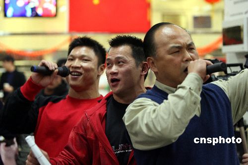 圖為中國男子舉重隊(duì)總教練陳文斌(右)和奧運(yùn)會(huì)冠軍張國政(中)、世界冠軍李宏利(左)一起歡歌過除夕。