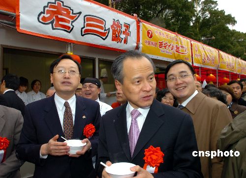 圖為中國(guó)駐日大使崔天凱(中)和中國(guó)駐名古屋總領(lǐng)事李天然(左)在老三餃子展臺(tái)前品嘗中國(guó)餃子。