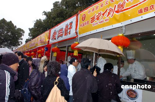 圖為當(dāng)?shù)厝毡久癖娬诿把┡抨?duì)品嘗中國(guó)餃子和刀削面。
