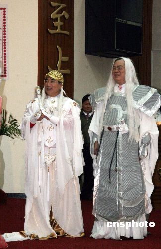 臺灣第七屆“立法院”十二日舉行新春團拜,院長王金平、副院長曾永權(quán)分別扮演布袋戲角色。王金平扮演的是“一頁書”,這個角色是象征正道的精神指標;曾永權(quán)扮演“葉小釵”,象征一個耿直專一、守信重諾的俠客。中新社發(fā) 徐長安 攝