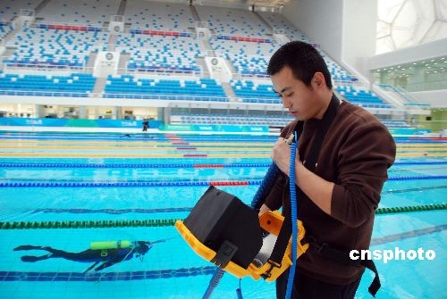 安檢人員用水下目鏡儀檢查北京奧運場館“水立方”水下設(shè)施。