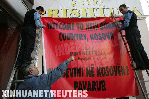2月14日,在塞爾維亞科索沃的米特羅維察鎮(zhèn),幾名阿族男子在一家旅館前用“歡迎來到新生的科索沃國”的標語作裝飾。有消息稱,科索沃將于近日單方面宣布脫離塞爾維亞而獨立。 新華社/路透
