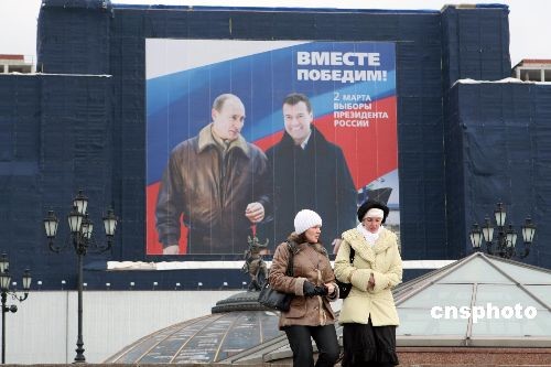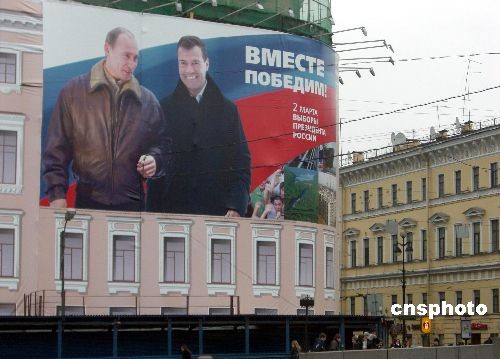 3月1日,在莫斯科紅場(chǎng)旁邊,現(xiàn)任俄羅斯總統(tǒng)普京與政府第一副總理、下屆總統(tǒng)的熱門(mén)侯選人梅德韋杰夫的巨幅海報(bào),上書(shū)“我們攜手贏取勝利”十分醒目。梅德韋杰夫曾多次表示,他若當(dāng)選后將繼續(xù)執(zhí)行普京路線。3月2日,俄羅斯將舉行總統(tǒng)大選。中新社發(fā) 田冰 攝