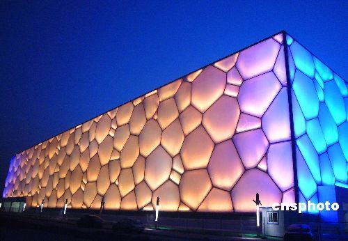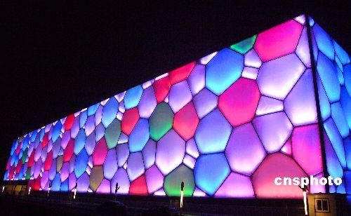 3月4日晚,北京國家游泳中心(“水立方”)在藍色主燈光的照射下晶瑩剔透,其間閃爍變幻的紅、黃、橙、綠等燈光組合更是鮮艷奪目,呈現(xiàn)出色彩斑斕如詩如畫的夢幻佳境。中新社發(fā) 玉龍 攝