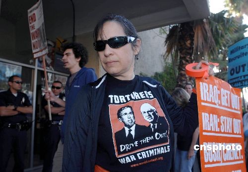 一位抗議者身穿印有布什和切尼頭像的衣服,上書“戰(zhàn)爭罪犯”。