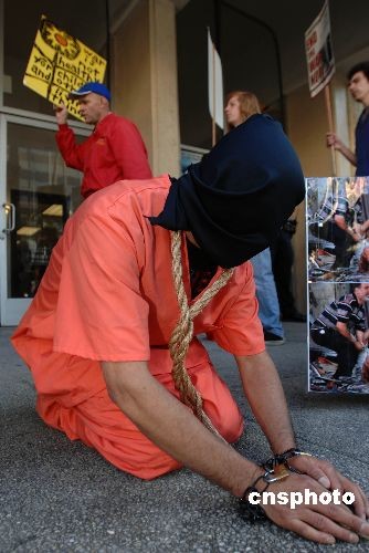 一名抗議者扮成戰(zhàn)爭罪犯伏地謝罪。