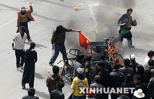 3月14日,一群不法分子在西藏自治區(qū)首府拉薩市區(qū)的主要路段實施打砸搶燒,焚燒過往車輛,追打過路群眾,沖擊商場、電信營業(yè)網(wǎng)點和政府機關,給當?shù)厝嗣袢罕娚敭a(chǎn)造成重大損失,使當?shù)氐纳鐣刃蚴艿搅藝乐仄茐。事后查明,這天,不法分子縱火300余處,拉薩908戶商鋪、7所學校、120間民房、5座醫(yī)院受損,砸毀金融網(wǎng)點10個,至少20處建筑物被燒成廢墟,84輛汽車被毀。有18名無辜群眾被燒死或砍死,受傷群眾達382人,其中重傷58人。拉薩市直接財產(chǎn)損失達24468.789萬元。