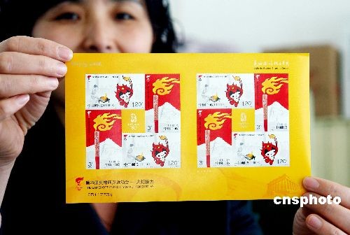 2008年3月24日,國(guó)家郵政局發(fā)行《第29屆奧林匹克運(yùn)動(dòng)會(huì)—火炬接力》紀(jì)念郵票1套2枚,小全張1枚。中新社發(fā) 馬健 攝