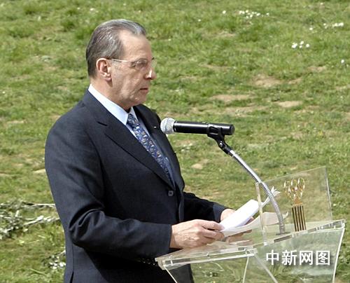 希臘當?shù)貢r間3月24日,北京二00八年奧運會圣火采集儀式在古奧林匹亞競技場舉行。國際奧委會主席羅格致辭。中新社記者 王歡