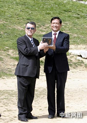 希臘當?shù)貢r間3月24日,北京二00八年奧運會圣火采集儀式在古奧林匹亞競技場舉行。北京奧組委主席劉淇接受希臘奧委會主席的贈禮。 中新社記者 王歡