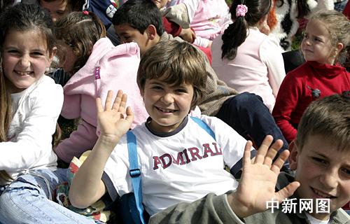 希臘當(dāng)?shù)貢r(shí)間3月24日,北京二00八年奧運(yùn)會(huì)圣火采集儀式在古奧林匹亞競(jìng)技場(chǎng)舉行。希臘小觀眾坐在草坪上觀看采集儀式。 中新社記者 王歡