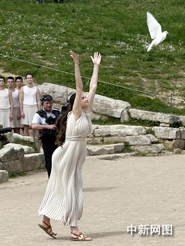 希臘當(dāng)?shù)貢r(shí)間3月24日,北京二00八年奧運(yùn)會(huì)圣火采集儀式在古奧林匹亞競(jìng)技場(chǎng)舉行,最高女祭司順利采集到火種。一名女祭司手捧白鴿走到眾人之前,面向古競(jìng)技場(chǎng)放飛白鴿。 中新社記者 王歡