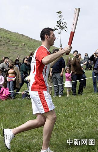 希臘當(dāng)?shù)貢r(shí)間3月24日,北京二00八年奧運(yùn)會(huì)圣火采集儀式在古奧林匹亞競(jìng)技場(chǎng)舉行,隨后火炬希臘傳遞開始。第一棒火炬手亞歷山大右手擎火炬,左手舉橄欖枝跑向顧拜旦墓。 中新社記者 王歡