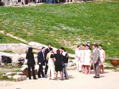 最激動(dòng)人心的時(shí)刻即將來(lái)臨,最高女祭司娜芙普利都將在赫拉神廟的凹面鏡前點(diǎn)燃奧運(yùn)圣火。從古競(jìng)技場(chǎng)到圣火采集地的赫拉神廟的路上,中間有一個(gè)通道,“禁地”前可謂戒備森嚴(yán),只有少數(shù)VIP貴賓才能進(jìn)入。這時(shí),章子怡也想起身近距離觀看點(diǎn)火儀式,但在通道前被安保人員攔住。他們顯然沒(méi)弄清楚這位美女的身份,很疑惑地看著章子怡,身邊的2008北京奧運(yùn)官方電影工作人員則趕忙解釋:“super star”(超級(jí)巨星)。但胸前只是掛著記者證,并非VIP證的章子怡,盡管舉著證交涉了半天,還是被攔在了赫拉神廟之外。