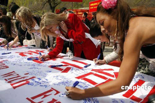 圖:國際旅游小姐簽名祝福北京奧運(yùn)