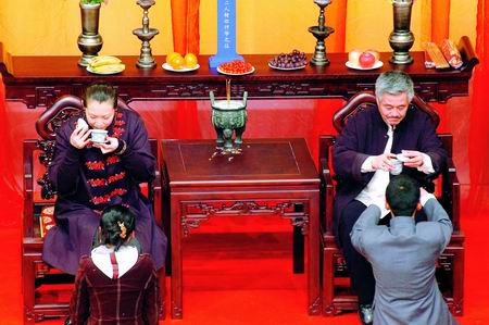 我覺得一個團(tuán)隊(duì)要有點(diǎn)規(guī)矩,師徒之間要有一種傳統(tǒng)。我是一個民間藝人,我經(jīng)營二人轉(zhuǎn)從沒有到有,從不景氣到想看買不到票,這個過程給我?guī)砗艽蟮氖斋@。那些學(xué)生,之前我都已經(jīng)一批一批收完了,我想在那天給他們一個證書、給他們一個忠告,讓他們知道趙門的規(guī)矩,怎么做人。那天收了35個,只有四五個是新收的學(xué)生,只是有一個排序,我給他們發(fā)了一個聘書,發(fā)了一個我給他們寫的字畫。