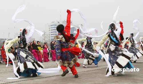 2008年3月29日,在北京雕塑公園西側(cè)廣場,由北京市文化局組織的廣場文藝演出正在緊張排練中。由兒童、中學(xué)生、大學(xué)生、年輕人到六七十歲的老人們組成的幾個(gè)演出板塊,都是為了3月31日參加天安門廣場的迎接奧運(yùn)圣火演出。為了迎接那最圣神的一天到來,演員們正緊張有序地排練著。