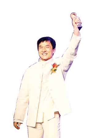 穿上唐裝的成龍?jiān)谂_(tái)上表示會(huì)繼續(xù)為國爭光。