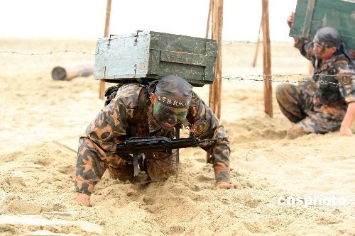 圖為陸戰(zhàn)隊員扛彈藥箱通過迂回鐵絲網(wǎng)。中新社發(fā) 李唐 攝
