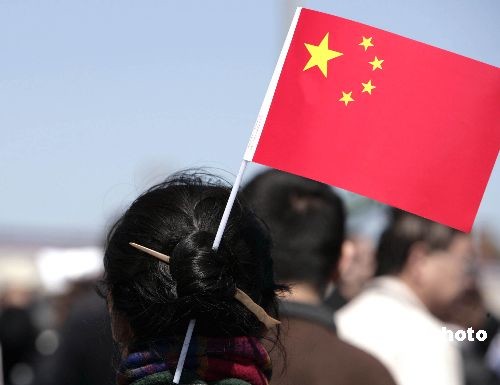 當?shù)貢r間四月九日,北京奧運圣火在美國舊金山進行傳遞,成千上萬的華人華僑為北京奧運圣火傳遞助威吶喊。一女子將五星紅旗插在發(fā)髻上參加火炬歡迎儀式。 中新社發(fā) 劉丹 攝
