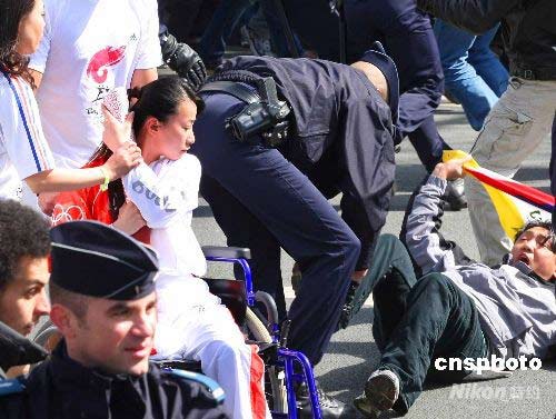 4月7日,奧運(yùn)火炬手金晶在北京奧運(yùn)會火炬接力巴黎站的傳遞活動(dòng)中奮力保護(hù)火炬。賈婷 攝